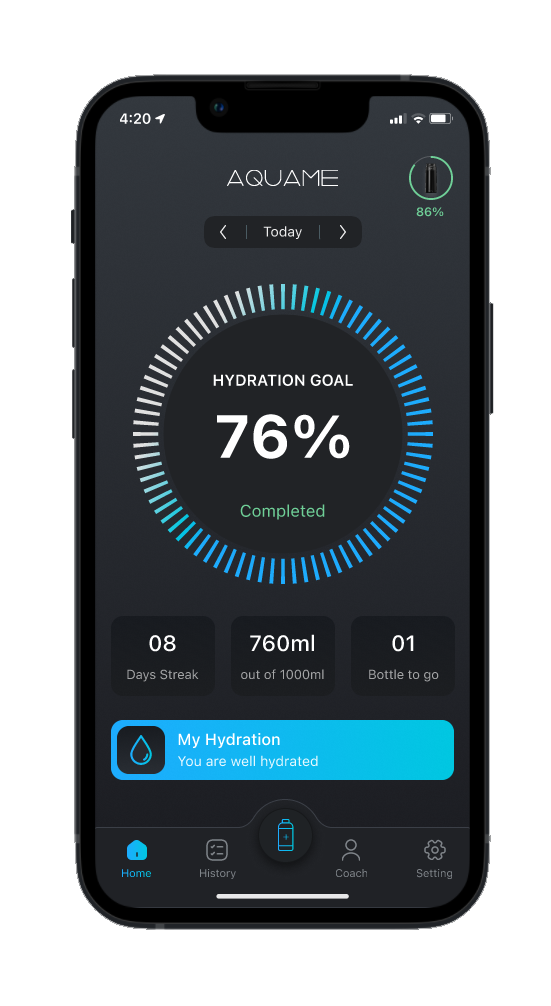 The AQUAME 2.0's Hydration Coach is a groundbreaking function designed to personalise your hydration strategy, offering unique insights and recommendations based on your lifestyle.